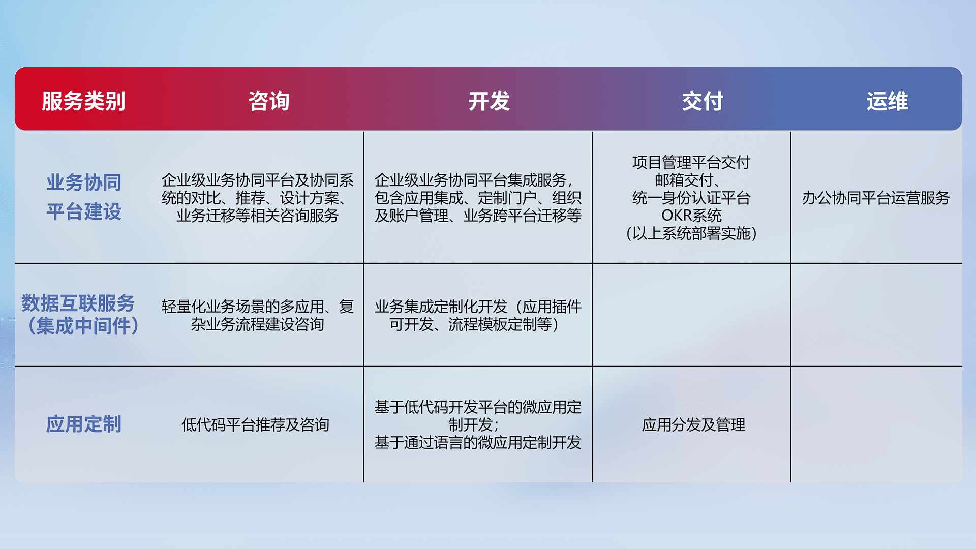 针对钉钉、、企微、、、、IDaas等平台级产品提供产品的规划、、、、方案、、、交付、、定制化开发等服务,,,,实现如统一协同办公、、、、智能客户服务、、、、混合会议管理、、、、智能数据查询、、、等业务场景,,,,实现数字化转型。。